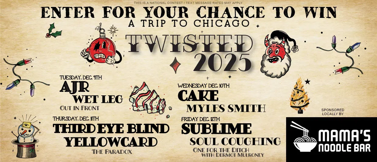 Four nights of rockin' holiday cheer in Chicago, featuring AJR, Cake, Third Eye Blind, Sublime, Wet Leg, Myles Smith, Yellowcard, Soul Coughing, and more! And you could be there for ALL. FOUR. NIGHTS.